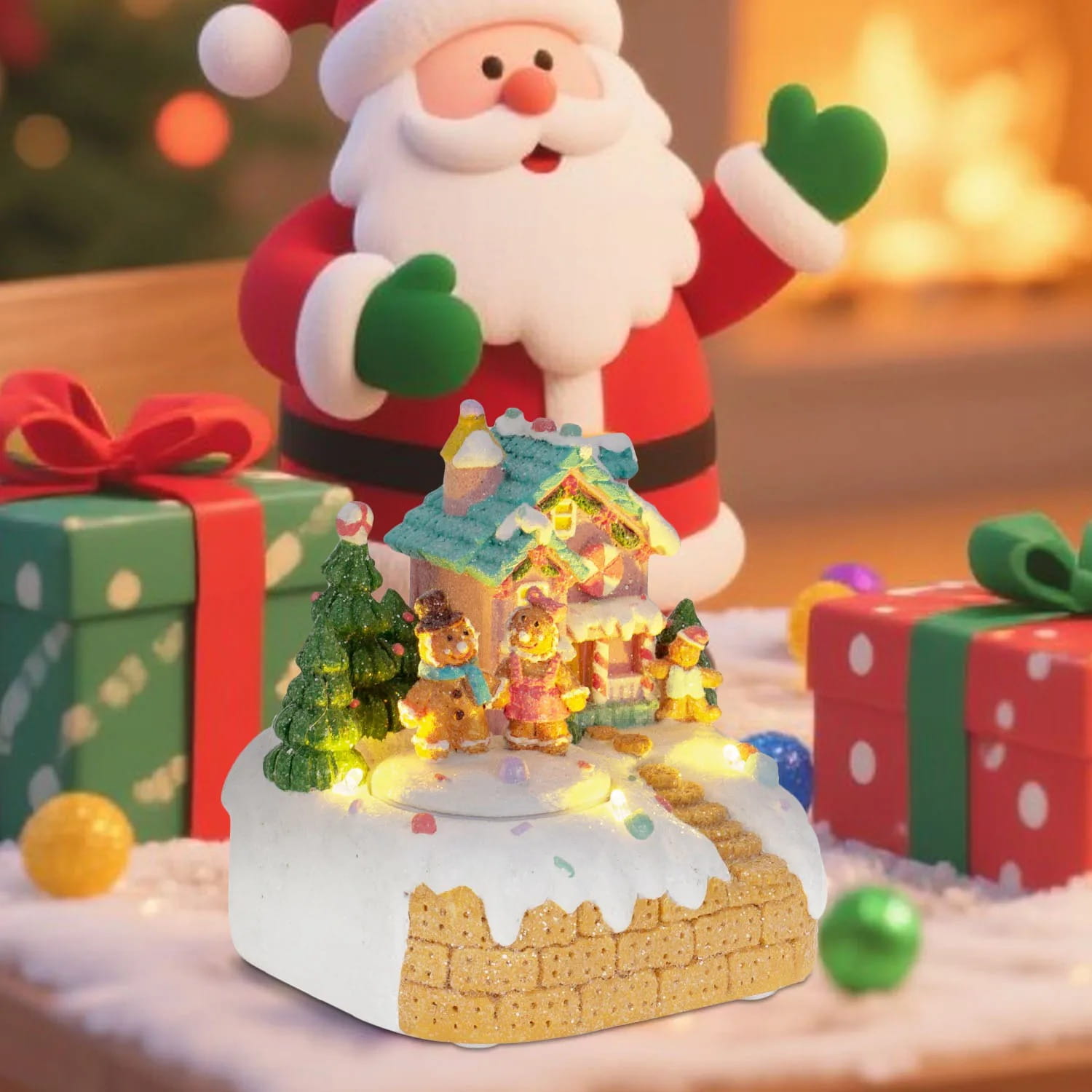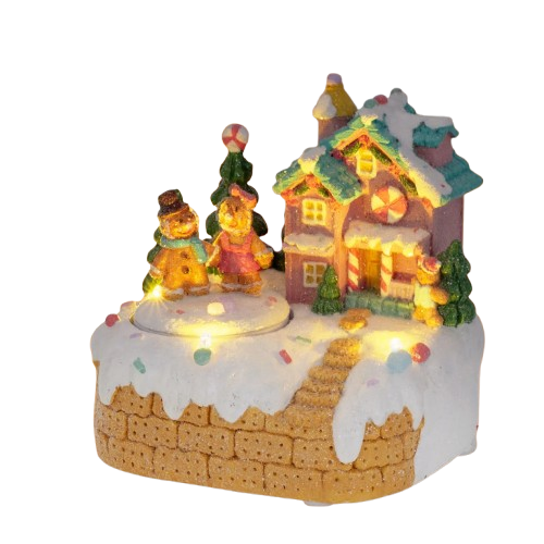 Urocza, Animowana Scenka: Obserwuj, jak para piernikowych ludzików wiruje na tle podświetlonego, cukierkowego domku. To widok, który zachwyci zarówno dzieci, jak i dorosłych.
